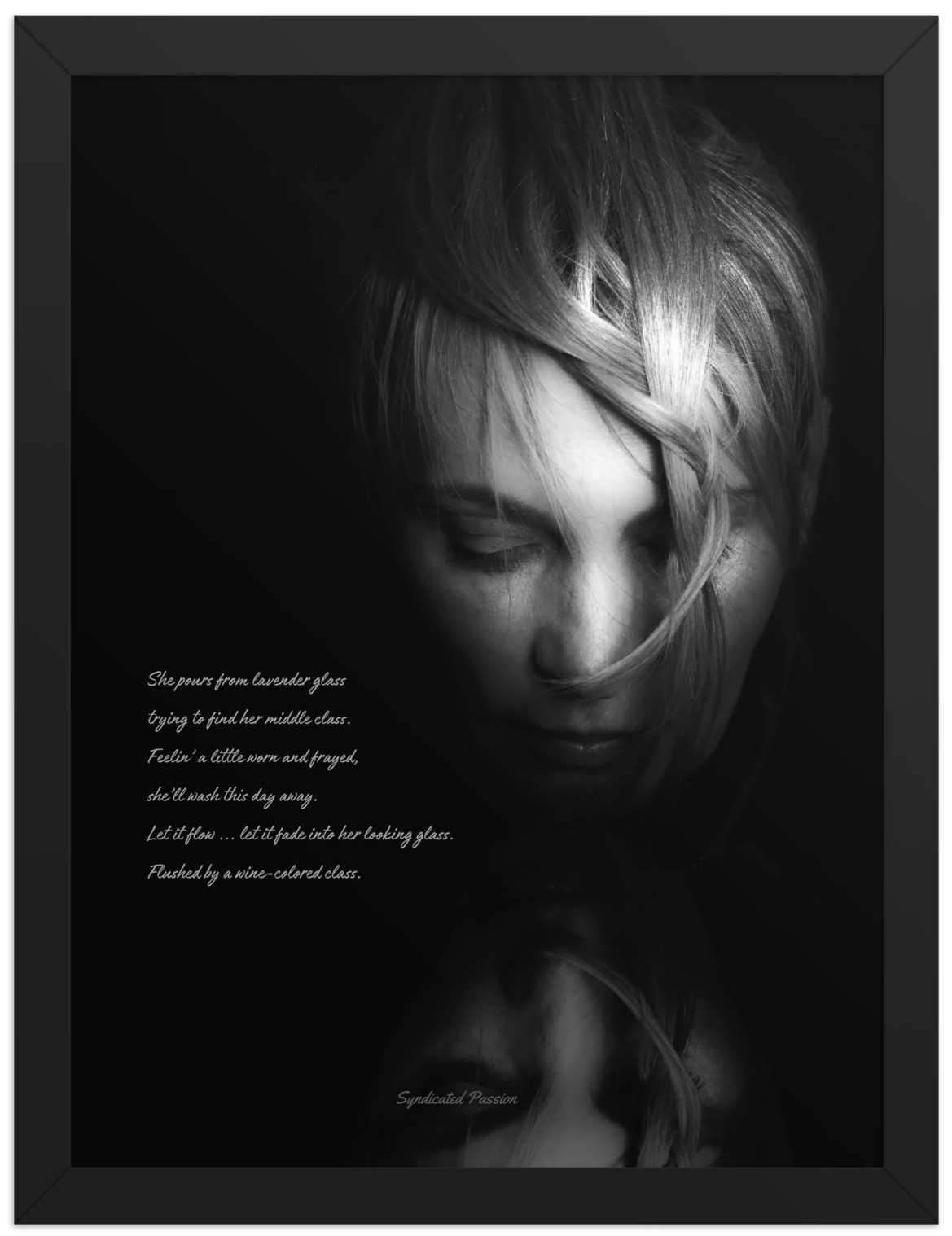 Somewhere along her journey she has lost sight of what is important to her in life. She has allowed the other class of people to beat her down in relationships along the way. And now, she is letting it all pour out through lavender glass (wine).